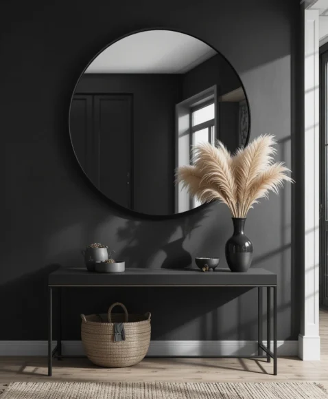 Place a large round mirror above the black entryway table to create a clean and balanced look. Add a small ceramic vase with neutral pampas grass and a decorative bowl for keys. This setup reflects light and makes the entryway feel brighter and more spacious.