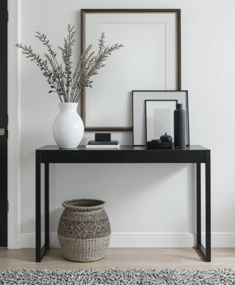 Create a sleek monochrome look with black and white decor pieces. A white ceramic vase, black picture frames, and a simple black-and-white photograph can make the entryway feel modern and sophisticated.