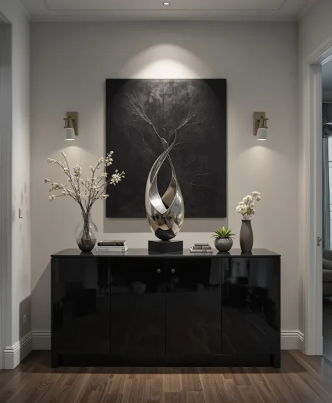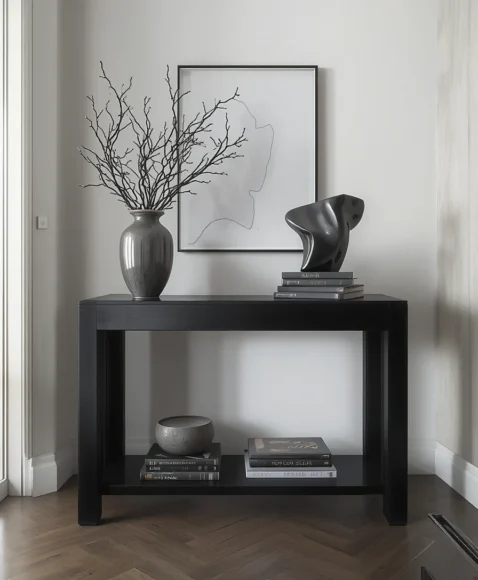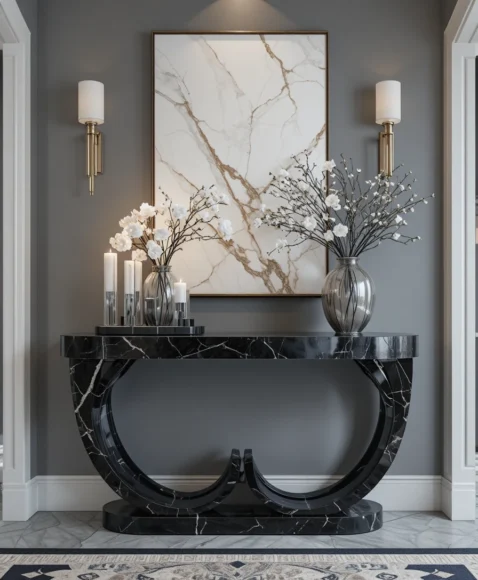 Combine the black table with marble trays, crystal vases, and elegant candles. This luxurious mix of materials creates a high-end entryway that feels sophisticated and welcoming.