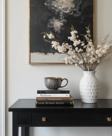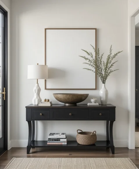 A black entryway table is one of the easiest ways to create a stylish and memorable first impression in your home. By mixing elements like mirrors, greenery, candles, artwork, and decorative trays, you can design an entryway that feels both functional and visually appealing.