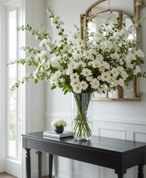 A tall clear glass vase filled with fresh flowers instantly brightens a black entryway table. White lilies, eucalyptus, or hydrangeas create a clean and elegant contrast.