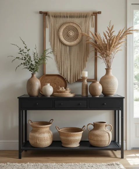 Incorporate macrame wall art, woven trays, and textured pottery for a relaxed boho-inspired entryway setup. The combination of textures softens the boldness of the black furniture.