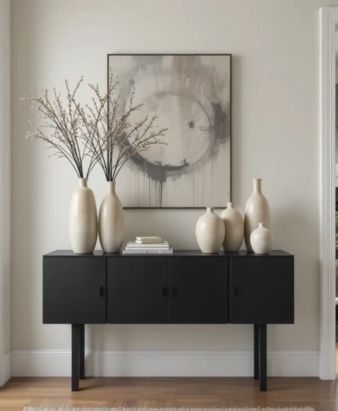 Style your table with two or three ceramic vases in soft neutral tones like beige, ivory, or sand. Vary the heights to create visual interest. A small stack of books beside the vases completes the simple yet elegant arrangement.