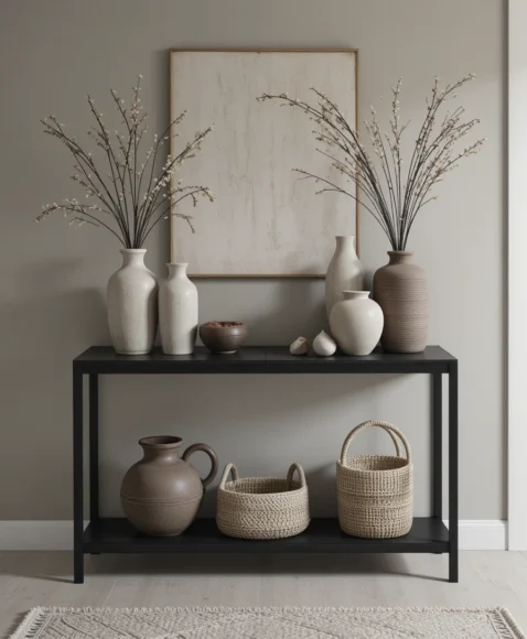 Decorate the table with stone vases, clay pottery, and textured fabrics. Neutral textures create a calm and sophisticated entryway design.