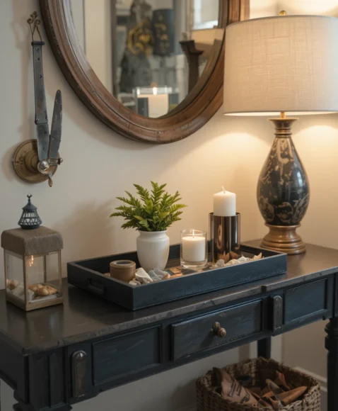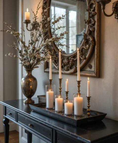 Create a cozy atmosphere with three decorative candles in different heights arranged on a tray. Brass or gold candle holders contrast beautifully with the dark table and add warmth to the entryway.