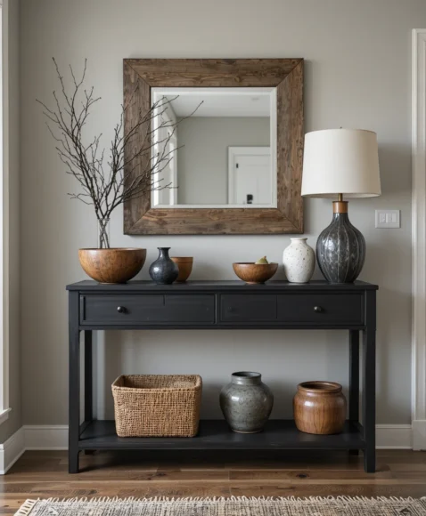 Combine rustic charm with modern contrast by decorating the table with wooden bowls, reclaimed wood frames, and textured pottery. The mix of dark furniture and warm wood tones creates a cozy farmhouse-inspired entryway.