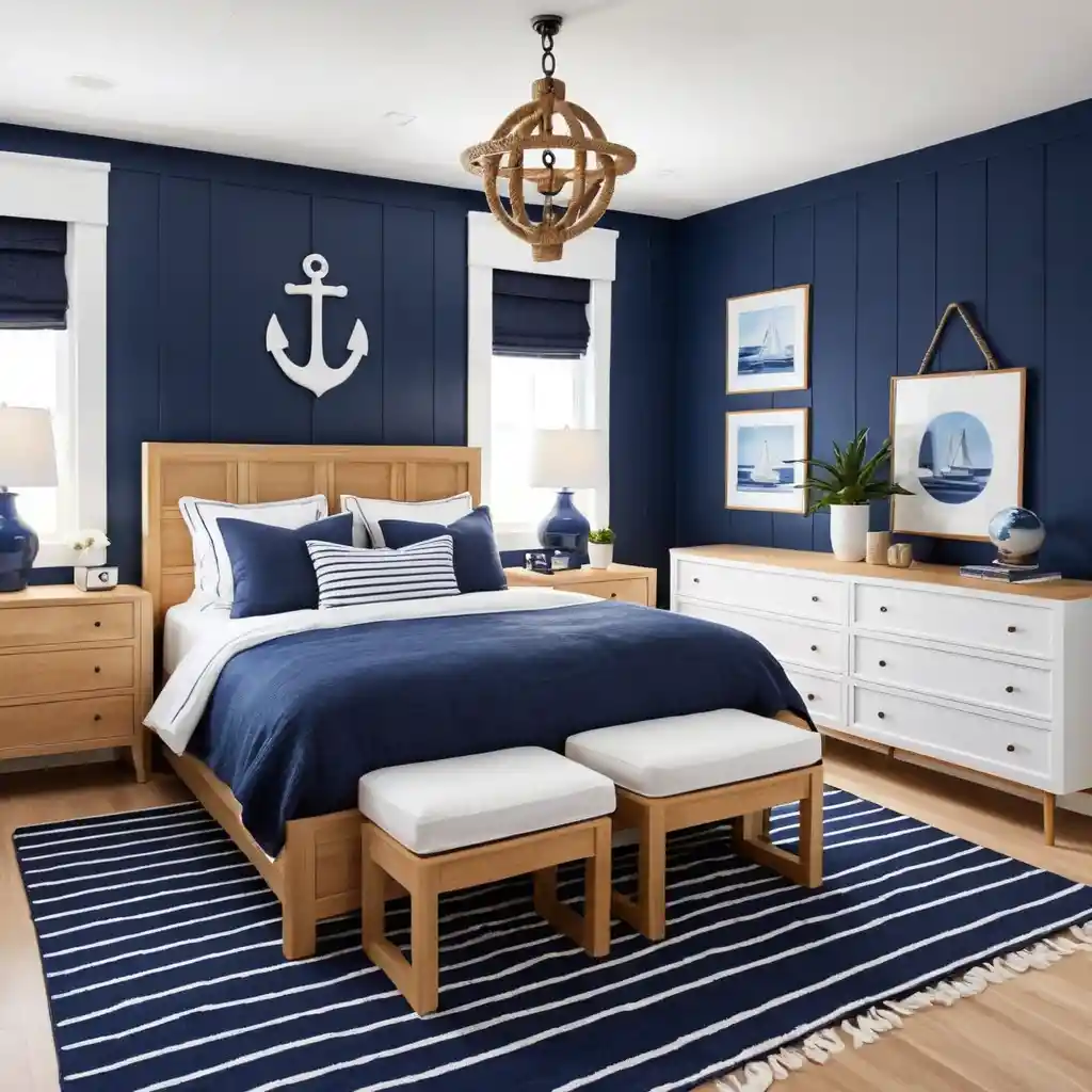 Create depth with a navy blue accent wall, balanced by white bedding and light wood furniture. Add decor such as anchor motifs and striped rugs for a nautical vibe.