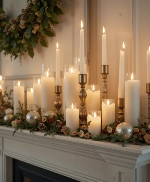 Use layers of candles, ornaments, greenery, and figurines to create depth. Mixing textures and heights makes the mantel visually dynamic and interesting.