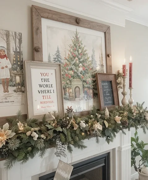 Add framed Christmas art or prints to your mantel. This stylish touch introduces color, pattern, and a modern aesthetic to traditional decorations.
