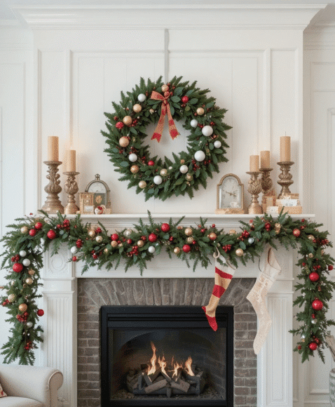 Drape a lush evergreen garland along your mantel and enhance it with pinecones, berries, and small ornaments. This timeless decoration brings natural texture and a traditional holiday look.