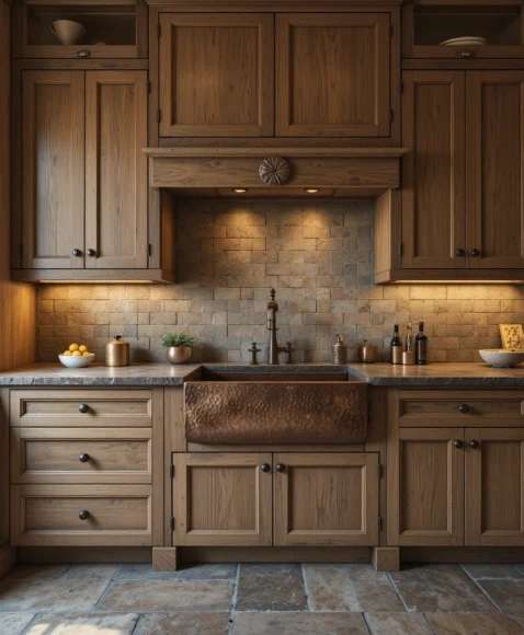 1. Hammered Copper Apron Sink with Wooden Cabinets