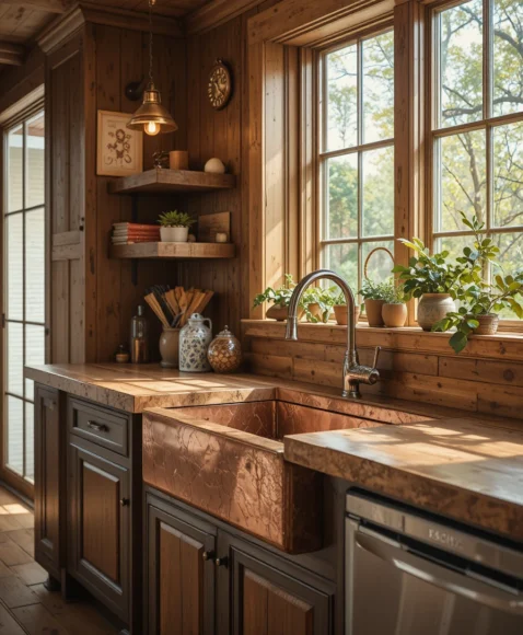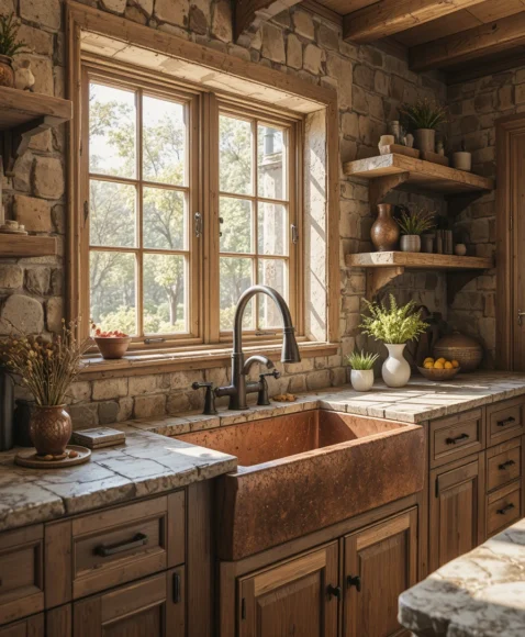 The rich tones of copper, combined with farmhouse textures like wood and stone, create a space that feels both cozy and elevated.