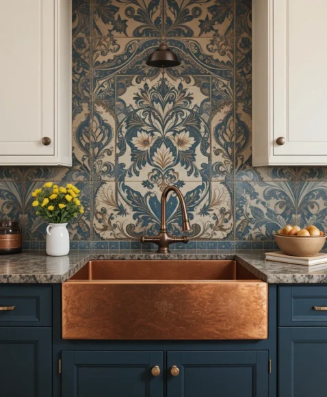 Adding patterned tiles around a copper sink creates a focal point. I imagine intricate designs complementing the warm metal. It adds personality and visual interest.