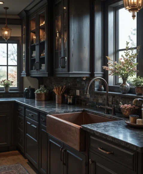 A darker cabinet palette makes the copper sink stand out even more. I imagine deep brown or charcoal tones enhancing the sink’s glow. It creates a rich and dramatic farmhouse kitchen.
