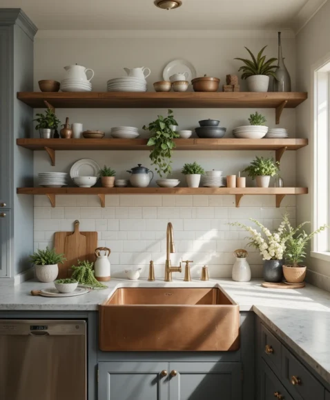 Open wooden shelves above a copper sink create a relaxed farmhouse vibe. I picture dishes and décor adding personality. The setup feels airy and inviting.