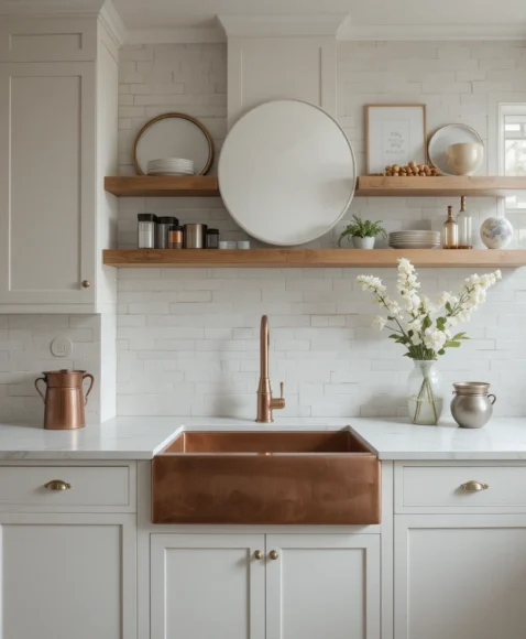 A deep copper sink against crisp white shaker cabinets creates a striking contrast. I imagine clean lines balanced with warm metallic tones. This combination feels fresh yet timeless.