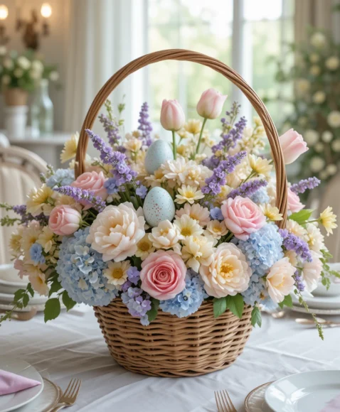 A woven basket filled with soft pink peonies, lavender tulips, pale yellow daisies, and baby blue hydrangeas creates a classic Easter look. Add decorative speckled eggs nestled between the flowers. The mix of pastel shades gives a light and cheerful spring vibe perfect for a brunch table.