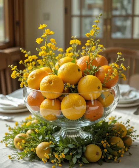 Combine Easter and spring freshness by placing lemons, oranges, and small yellow flowers in a clear glass bowl. Add greenery around the base. The vibrant yellow and orange tones create a sunny and energetic centerpiece.