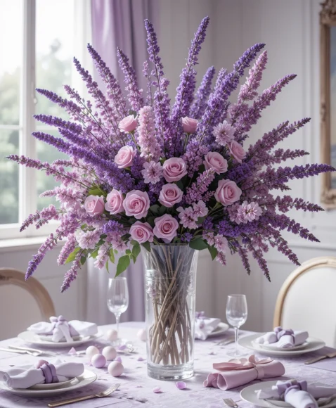 Fill a long vase with lavender flowers, lilac branches, and soft purple roses. Keep the color palette within different shades of purple for a calming and elegant look that matches spring themes perfectly.