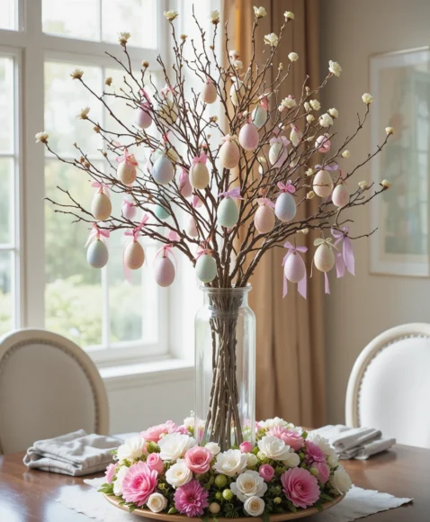 Place decorative branches in a tall vase and hang pastel Easter eggs from the branches using ribbons. Surround the base with pink and white flowers. This tall arrangement adds height and visual interest to your table.