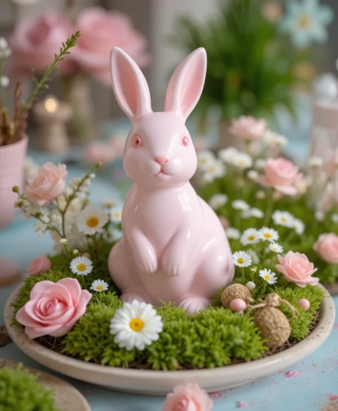 Use a light pink ceramic bunny as the focal point. Surround it with bright green moss, mini roses, and tiny white flowers. This centerpiece looks adorable for kids’ Easter brunch tables.