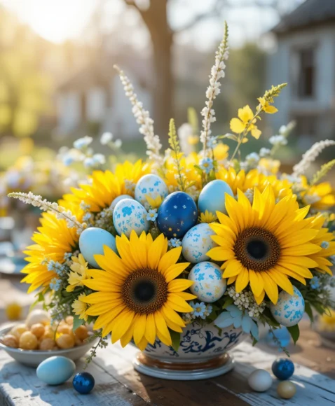 Combine bold yellow sunflowers with navy or soft blue decorative eggs. The contrast between yellow and blue creates a vibrant and eye-catching Easter table design perfect for outdoor gatherings.