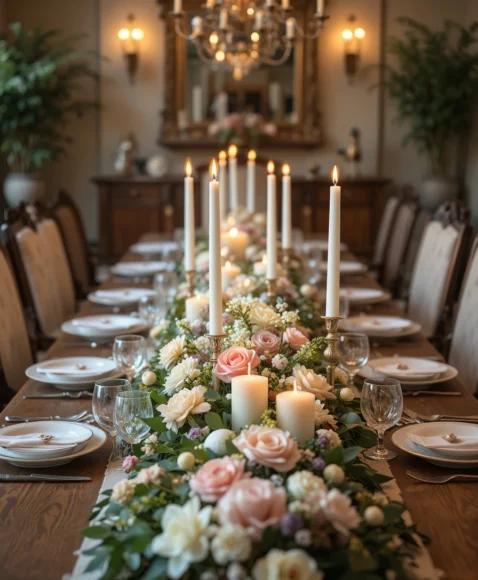 Create a long runner using greenery and pastel flowers. Place white or blush candles evenly across the arrangement. This design stretches across the entire table and feels luxurious yet welcoming.