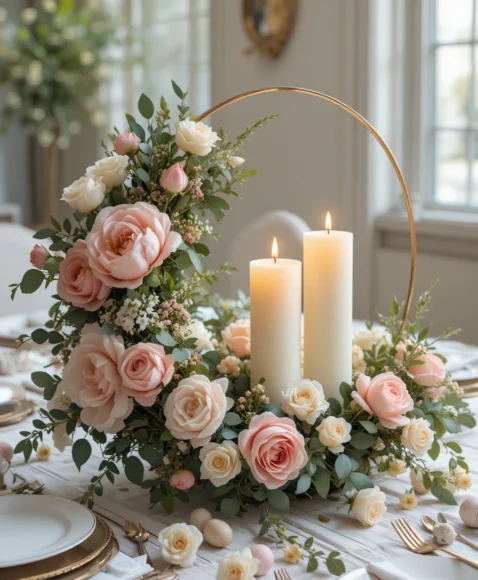 Lay a large decorative hoop flat on the table and decorate one side with pink peonies, eucalyptus, and white roses. Place candles inside the hoop for a unique and modern Easter centerpiece idea.