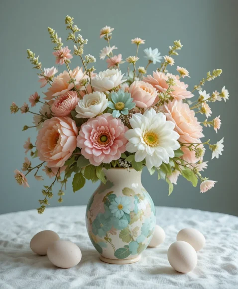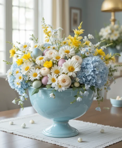 Choose a large bowl in robin’s egg blue and fill it with white daisies, yellow ranunculus, and pale blue hydrangeas. Scatter decorative eggs in soft pastel shades inside the arrangement for extra detail.