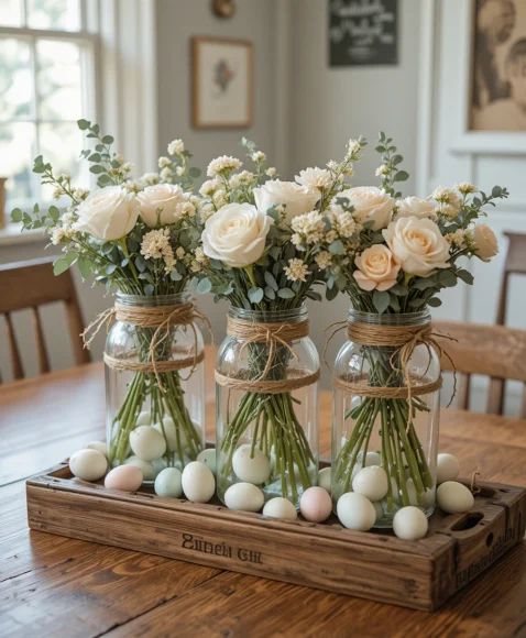 Place three mason jars on a wooden tray and fill them with white roses, eucalyptus leaves, and light peach carnations. Wrap twine around the jars and add small pastel eggs at the base. This centerpiece works beautifully for farmhouse-style homes and neutral dining spaces.
