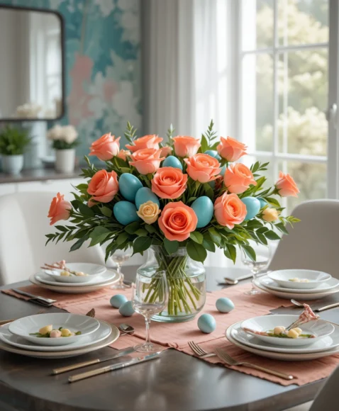 For a modern twist, mix coral roses with teal decorative eggs and deep green leaves. This bold color pairing adds personality and makes your Easter table stand out from traditional pastel themes.