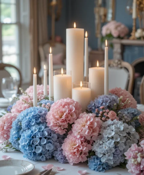 Group several white candles of different heights in the center. Surround them with blue and pink hydrangeas for a soft romantic feel. The layered heights create depth and elegance.