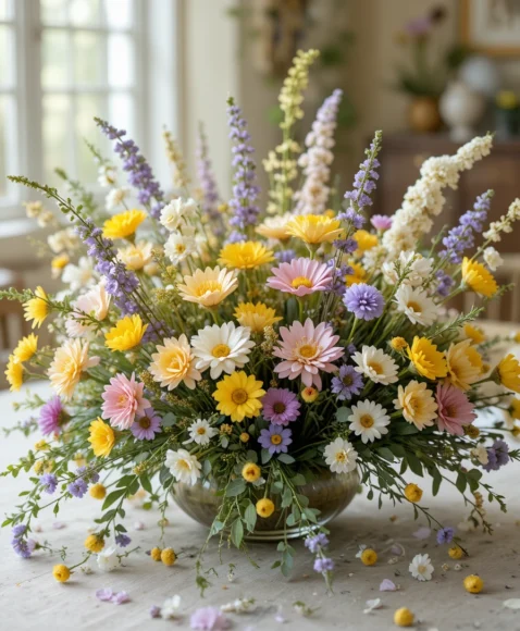 Design your table to look like a blooming meadow. Use a variety of wildflowers in yellow, pink, purple, and white, mixed with natural greenery. Keep the arrangement loose and organic for a fresh outdoor look.