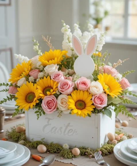 Use a white wooden box and decorate the front with a small bunny silhouette. Fill it with bright yellow sunflowers, pink roses, and soft green foliage. Add tiny carrots or moss accents for a playful yet stylish Easter table design.