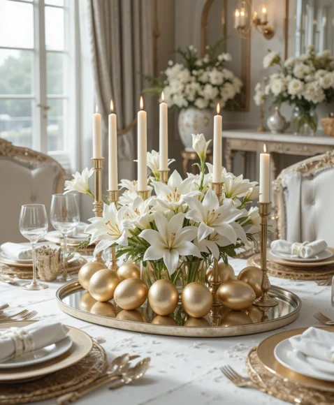 For a more sophisticated look, combine white lilies, ivory candles, and gold-painted Easter eggs. Arrange them on a mirrored tray to reflect light. The white and gold color scheme adds elegance and is perfect for formal Easter dinners.