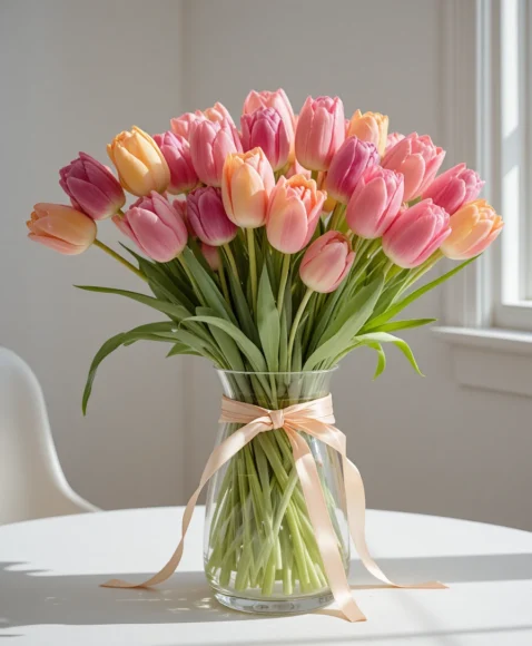 Clear glass vases filled with vibrant pink, purple, and yellow tulips create a simple but stunning centerpiece. Tie a satin ribbon around the vase in a matching pastel shade. The transparent vase highlights the fresh green stems for a clean spring look.