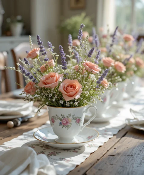 Place small floral arrangements inside vintage teacups. Use light coral roses, lavender sprigs, and baby’s breath. Arrange the teacups along the center of the table for a charming cottage-style Easter setting.