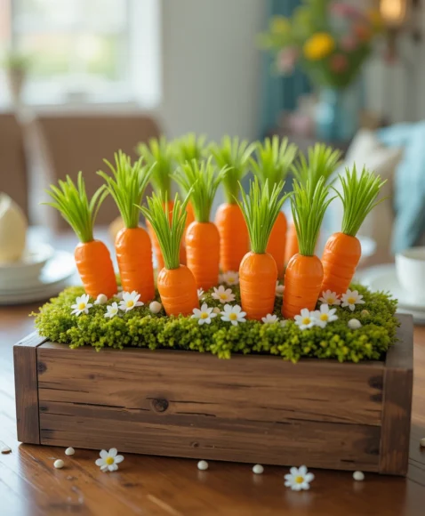 Fill a shallow wooden box with artificial grass or green moss. Insert bright orange faux carrots standing upright, surrounded by small white flowers. This colorful and playful design is perfect for family-friendly Easter celebrations.