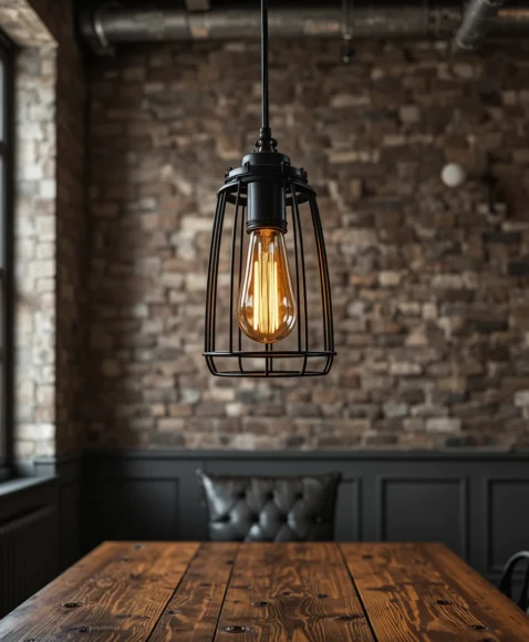 A black metal cage pendant paired with an exposed Edison bulb creates a bold rustic look. I imagine it hanging above a dining table, casting warm shadows. The industrial edge blends beautifully with farmhouse interiors.