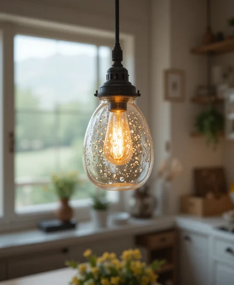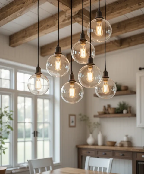I love the charm of mason jars turned into pendant lights. The clear glass softly diffuses warm light, creating a cozy glow. Hanging them in a row over a wooden kitchen island adds a classic farmhouse touch that feels both simple and inviting.