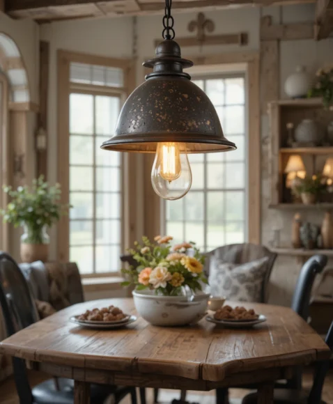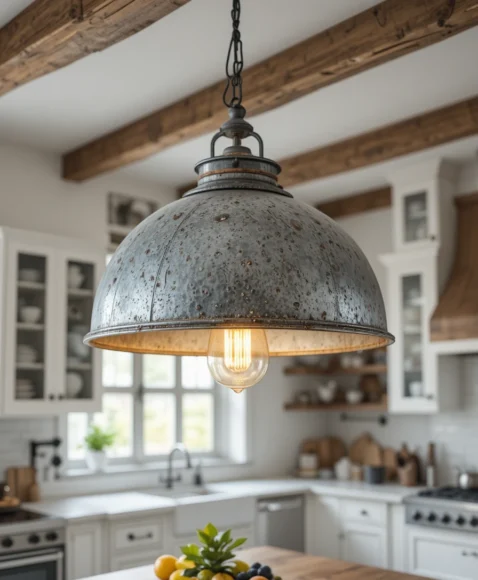 A large metal dome pendant with a weathered finish feels perfectly rustic. I like placing it above a farmhouse table or kitchen island. Its wide shade directs light downward for both style and function.