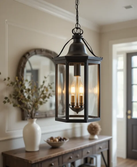A lantern-inspired pendant with a metal frame brings vintage character. I see it hanging in an entryway, creating a welcoming glow. It pairs well with wooden furniture and neutral tones.