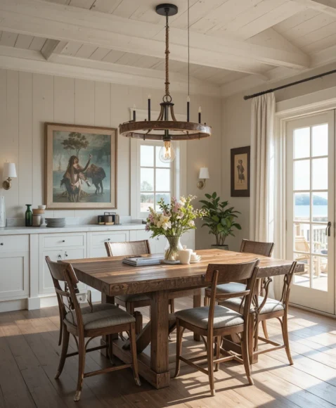 A reclaimed wood beam suspended from the ceiling with multiple hanging bulbs gives a strong farmhouse statement. I picture thick ropes or chains holding it up. This design adds texture and a handcrafted feel to the room.