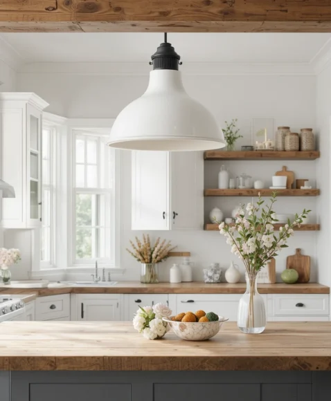 A white enamel shade with black or brass details creates a clean farmhouse look. I love how it brightens the room while maintaining a rustic edge. It’s ideal for kitchens with light color palettes.