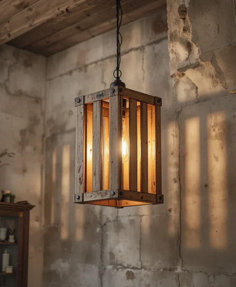 A pendant shaped like a wooden crate adds a unique rustic element. I picture light shining through the slats, creating shadows. It feels handcrafted and full of personality.