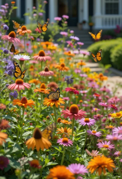Coneflowers, milkweed, and zinnias fill this sunny bed made for winged visitors. The constant movement of butterflies turns your front yard into a small wildlife show. Plus, it supports local pollinators beautifully.