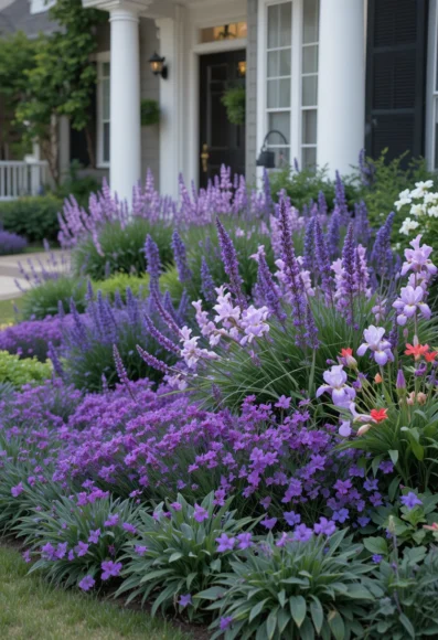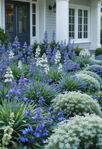Cool blues and silvery greens fill this calming bed—think bluebells, lamb’s ear, and dusty miller. The palette soothes and feels elegant. It pairs well with modern architecture or coastal vibes.