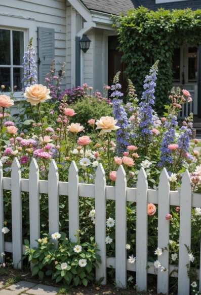 A small white picket fence frames this overflowing bed of roses, delphinium, and daisies. Plants spill casually over the edges, giving it a lived-in charm. Think grandma’s garden meets storybook front yard.
