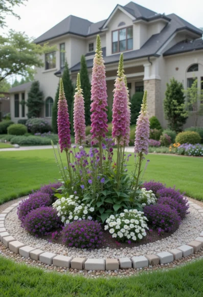 A ring of gravel surrounds a circular flower bed filled with tall, dramatic blooms like foxglove and ornamental allium. The separation from grass keeps it neat. It becomes a sculptural feature on its own.