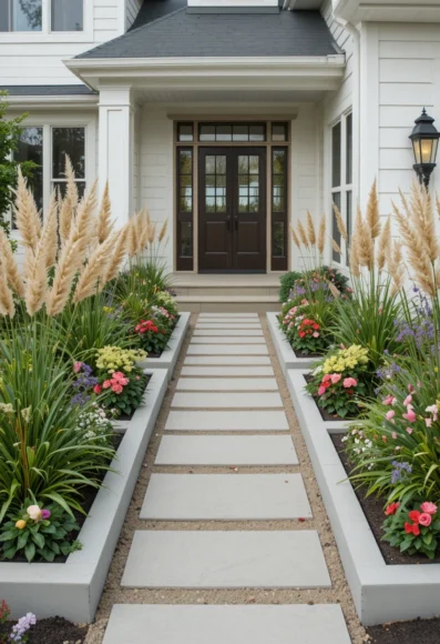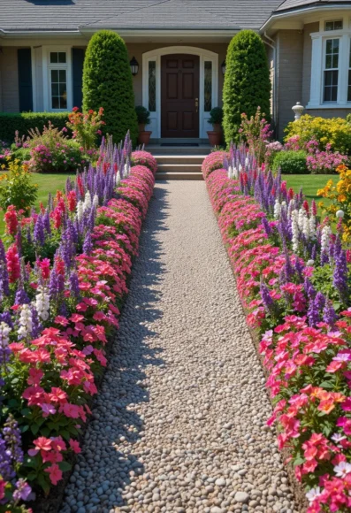 A gravel path leads straight to your front door, flanked by twin flower beds bursting with color. Salvia, snapdragons, and phlox fill the sides. It’s like walking through a flower-lined hallway.